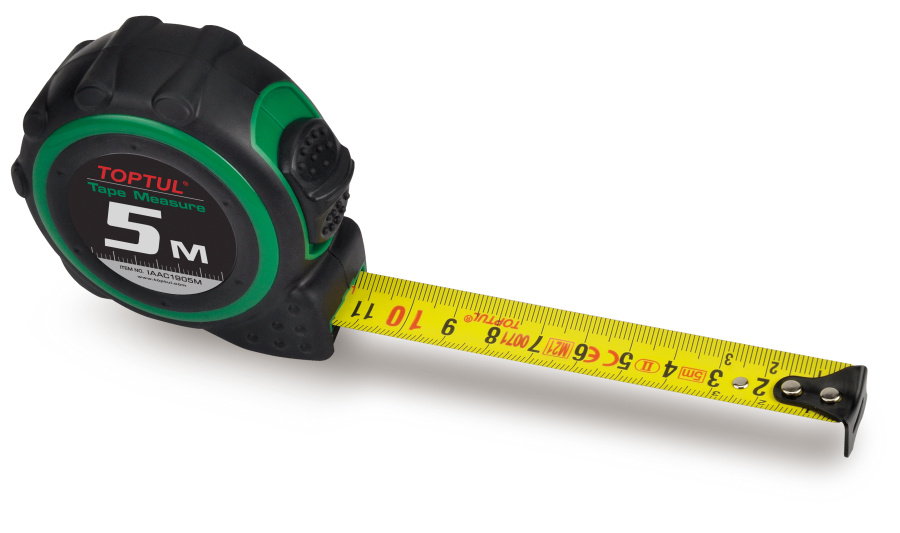 Рулетка 5м профессиональной серии TOPTUL, обладает повышенной устойчивостью к ударам благодаря прорезиненному корпусу.